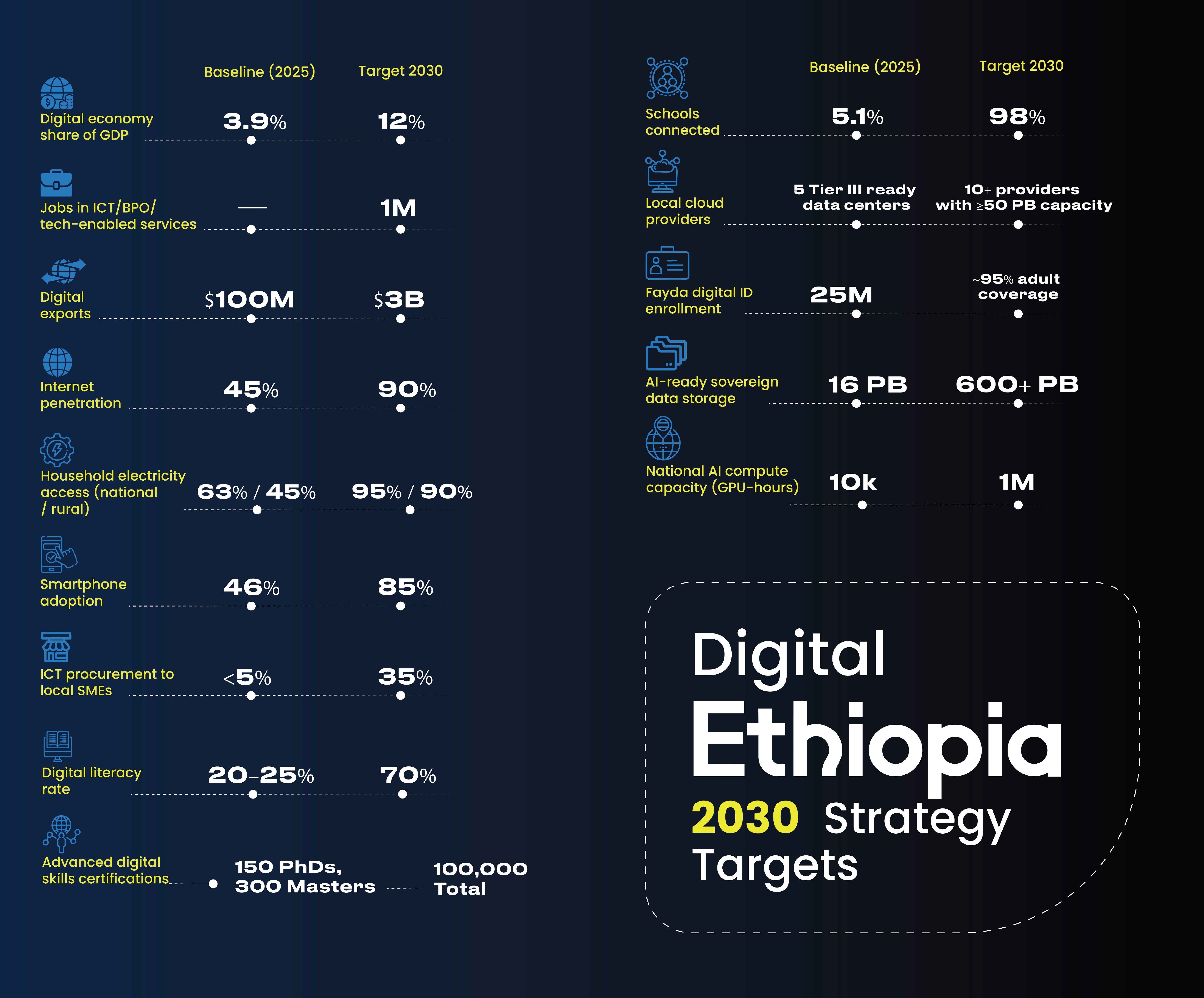 challenged not in planning, but in execution,” a rare admission in Ethiopian policy. Building on progress, including 63% electricity access, 45% internet penetration, 25 million Fayda digital ID enrollments, and more than 800 digitized government services, the roadmap sets ambitious numeric goals: 60% internet penetration by 2027, 90% by 2030, and 95% household electricity access nationally, 90% in rural areas by 2030.